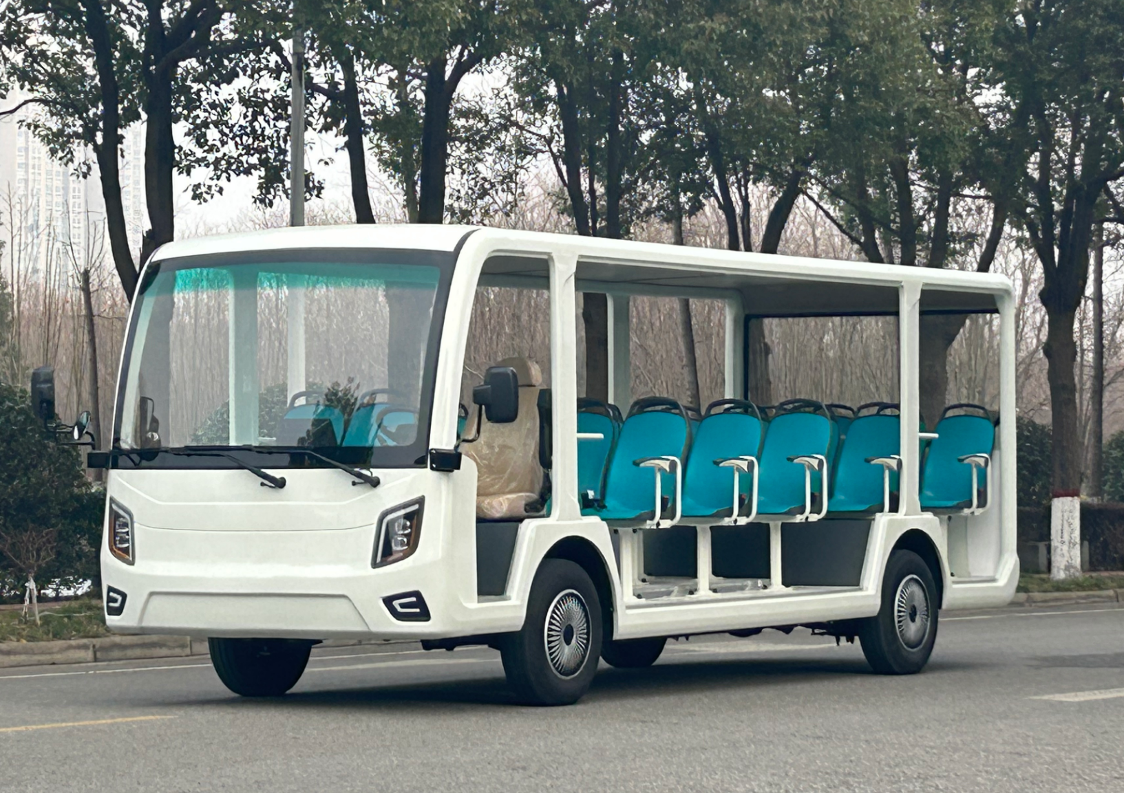 2.驱动系统:大功率交流永磁同步电机(常见 35kW 水冷),CURTIS / 英博尔高端电控;最高车速 30km/h(符合景区限速标准),满载最大爬坡度≥15%;
